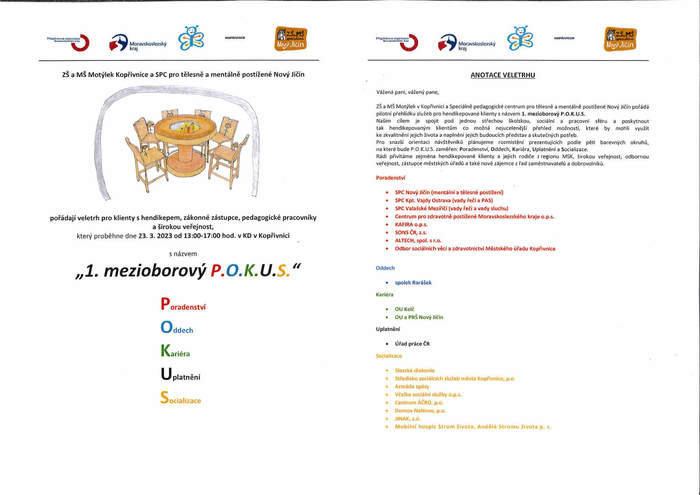 Dovolujeme si Vás pozvat na 1. mezioborový P.O.K.U.S. - veletrh pro klienty s hendikepem, zákonné zástupce, pedagogické pracovníky a širokou veřejnost.
