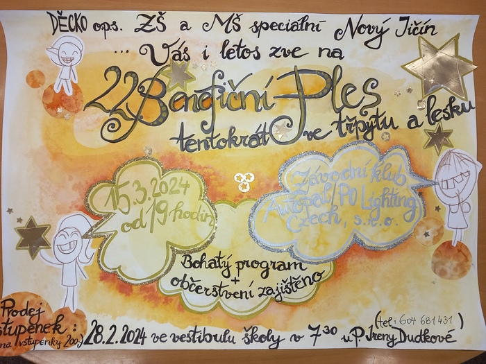 V pátek 15. 3. 2024 zaplnily sál Závodního klubu Autopal / PO Lighting Czech, s.r.o. téměř tři stovky spokojených hostů tradiční benefiční akce, na jejíž přípravě se podílejí především zaměstnanci školy. Letošní program zahájili naši žáci světelnou show nazvanou Noční nebe. Velkým zážitkem bylo umělecky ztvárněné vystoupení slečny na vozíčku s tanečním doprovodem a skupinové vystoupení členů Tanečního klubu Gradus ze Štramberku. Již tradiční "půlnoční" překvapení si připravili zaměstnanci školy, tentokrát na cirkusové téma. Celý večer hrálo k tanci a poslechu hudební trio z Hranic.